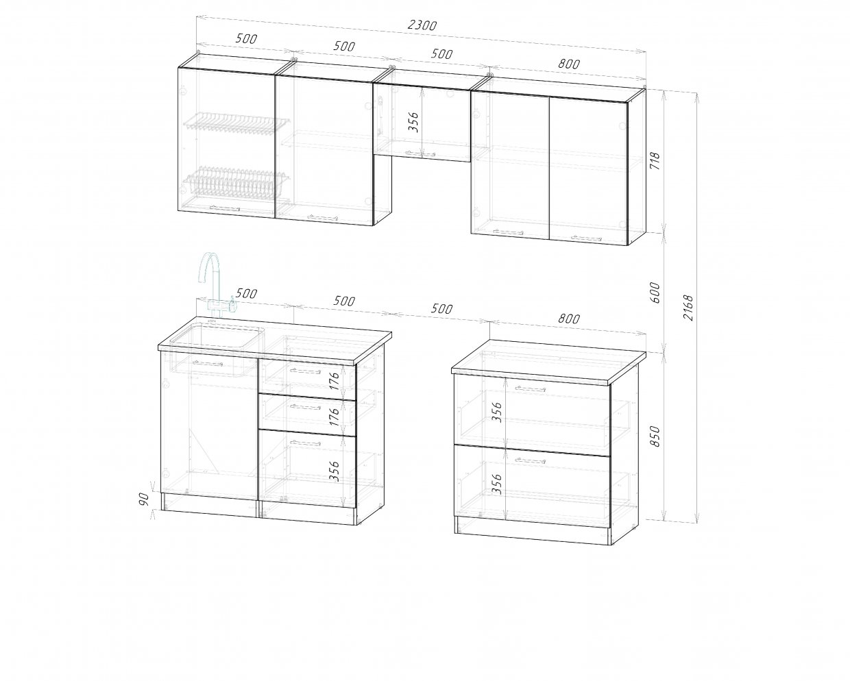Ширина: 2300 мм; Глубина: 600 мм (со столешницей)